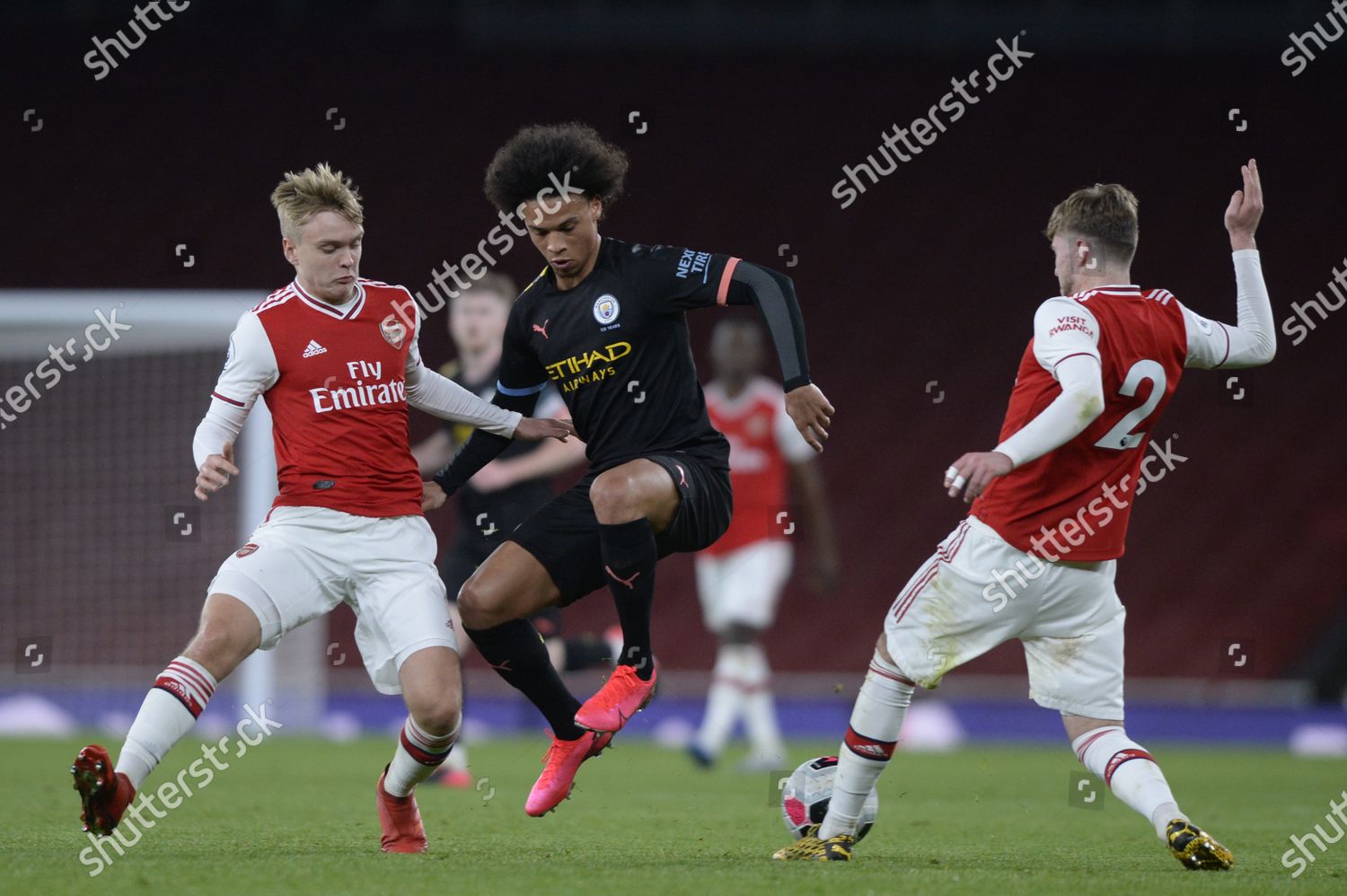 London England February 28th Leroy Sane Of Manchester City U23 Taking On Zak Swanson Of Arsenal U23 During The Premier League 2 Match Between Arsenal Under 23 And Manchester City Under