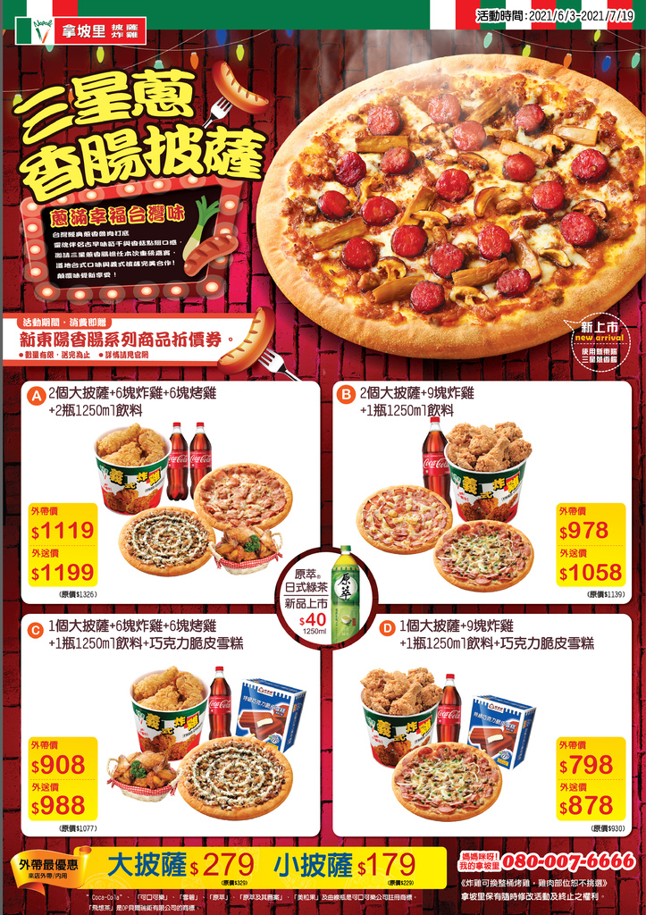 外帶價489元 外送價569元原價698元 拿坡里套餐優惠6-9人歡聚 全家炸雞餐. 拿坡里 菜單與推薦 最新優惠 支付優惠. 4塊義式炸雞 小披薩 1250ml 瓶裝飲料.