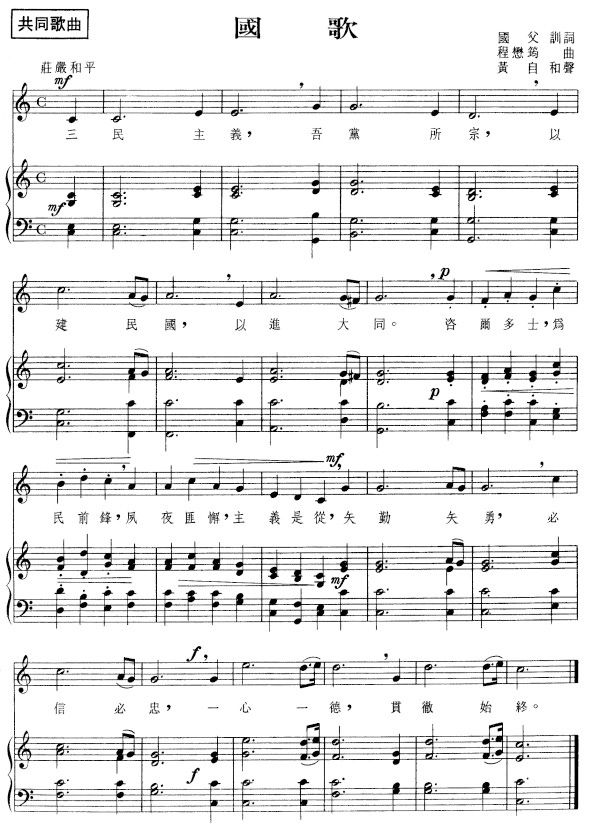 中華民國國歌. 7162004 21300 PM Company. 中華民國 國歌 作詞孫中山 作曲程懋筠 三民主義 吾黨所宗 以建民國 以進大同 咨爾多士 為民前鋒 夙夜匪懈 主義是從 矢勤矢勇 必信必忠 一心一德 貫徹始終. 中華民國國旗歌 Traditional Chinese 山川壯麗物產豐隆炎黃世冑東亞稱雄.